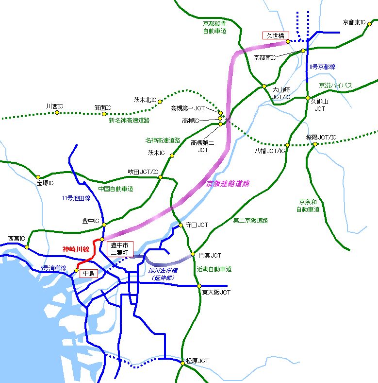 神崎川線の構想自体は残っているかは微妙な感じですが、京阪連絡道路については未だに構想が残ったようで、京都市で未開通の阪神高速道路(京都高速)久世橋線・堀川線・西大路線の3路線を見直す為に設立された「京都市京都高速道路検証専門委員会」の平成26年1月7日に行われた第3回検証専門委員会ににて、将来のネットワークとして京阪連絡道路が上げられています。
