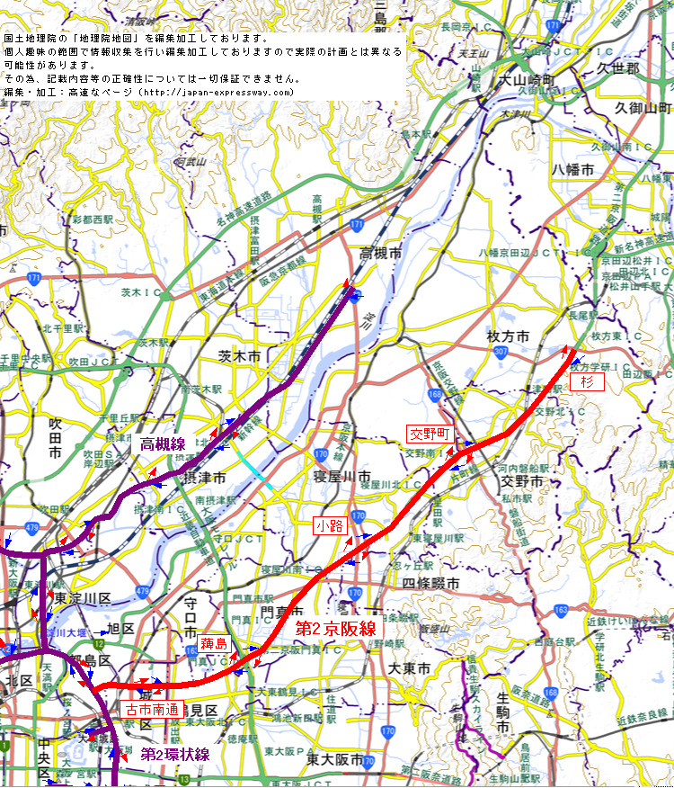 第2環状線などと同様に昭和45年に答申された路線で、第2環状線から枚方方面へと伸びる放射路線です。この第2京阪線のルートや道路構造等を見直したものが現在の淀川左岸線延伸部で、大阪市内の都島区〜門真JCTまではほぼ同じルートを通しています。