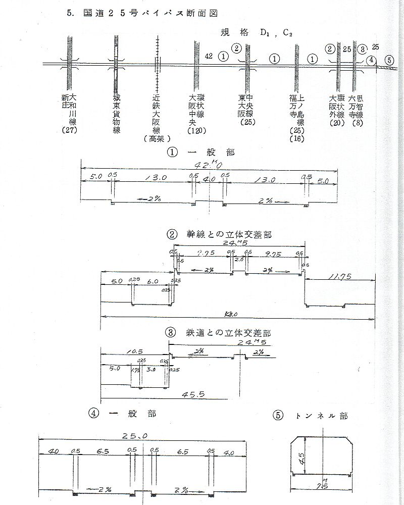 八尾線は昭和45年に答申されて路線ですが、それより以前に昭和44年8月に大阪府土木部計画課にて作成された「大阪都市圏基本計画策定資料(U)」という資料には、この八尾線と酷似するルートで国道25号線バイパスの構想が記載されており、そこには「構造的には都市高速道路を抱き込む形とし、平面部はD-1級6車線、高速部はB-2級4車線とし、幅員は42mとした。」という記述がありました。恐らくはこの都市高速道路というのが昭和45年答申の阪神高速八尾線だと思われます。