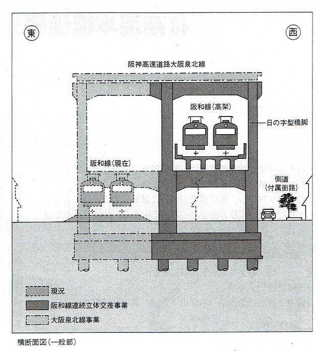 ↑泉北線と阪和線との二重高架部分の断面図です。