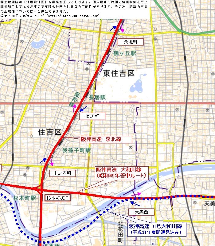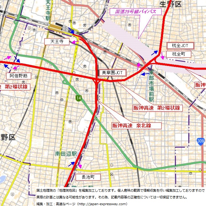 昭和57年に構想が見直された際に、第2環状線とのJCTであった美章園がJCTではなくなり、代わりに天王寺駅方面への出入口が追加されています。また、この昭和57年の変更では当初は大和川線とは川の北岸の杉本町付近にJCTが構想されていましたが、大和川線のルートが南岸を通るルートに変更されたため、JCTの位置も浅香付近に変更されています。