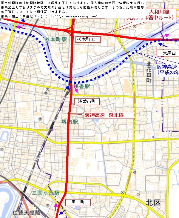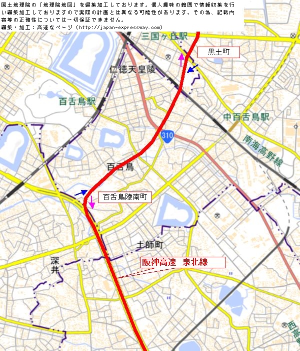 東八田付近に出入口を設け、さらに阪和自動車道とのジャンクションも設けて、和歌山方面へ接続する計画でした。 東八田からは府道下石津泉ヶ丘線の本線に直結し、泉北ニュータウンと大阪市内をダイレクトに結ぶ「泉北線」の名に相応しい阪神高速道路となるはずでした。尚、府道下石津泉ヶ丘線との直結予定箇所は、深井駅前交差点の立体交差の為に建設された高架道路が接続しています。