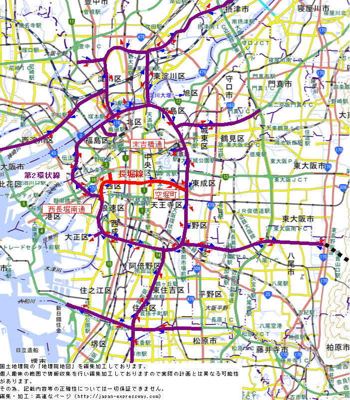 空堀町からはルートが曖昧なのですが、長堀通りから少し南反れてちょうどJR大阪環状線(長堀線計画当時は国鉄)の玉造駅を跨いで東へ進み、平野川上の東成区南中道町付近で第2環状線と接続する計画でした。