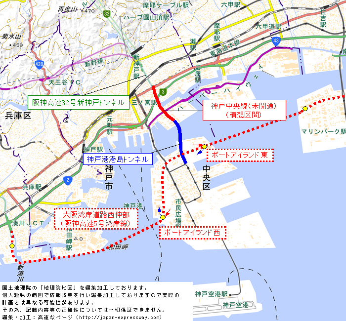 現在の32号新神戸トンネルから南進して神戸港港島トンネルを結ぶものです。新神戸トンネルと神戸港島トンネルと合わせて神戸中央線という地域高規格道路を形成します。未開通の新神戸トンネル神戸2号出入口〜神戸港港島トンネル間については、それぞれの道路に延伸用の準備がされていますが、都市計画がされておりません。神戸市でも構想の具体化を強く推している雰囲気はなく、神戸中央線の未開通区間については当分進展がないかと思われます。